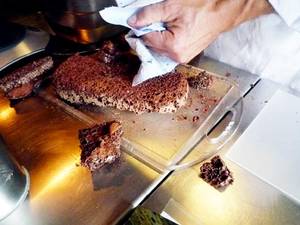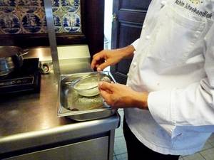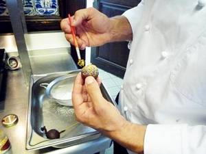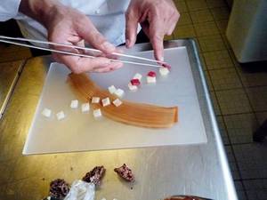 Achim Schwekendiek bleibt mit seiner Variation des Klassikers „Birne Helene“ relativ nah am Original, das Ende des 19. Jahrhunderts von Frankreichs Kochtitan Auguste Escoffier anlässlich der Aufführung von Jacques Offenbachs Operette „Die schöne Helena“ in Paris kreiert wurde. Bei Escoffier werden frische, geschälte Birnenhälften in mit Vanille parfümierten Läuterzucker pochiert, auf Vanille-Eis drapiert, mit kandierten Veilchen verziert und mit getrennt gereichter heißen Schokosauce serviert. Auch Schwekendiek setzt Eis und Sauce ein, backt aber Canachekugeln dazu und garniert mit zweierlei Birnengelee. Exclusivrezept mit 9 Step-Fotos.