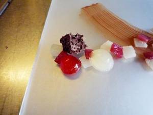 Die Birnen schälen und in feine Plättchen schneiden. Von einer Birne die Plättchen in Birnensaft pochieren, von der anderen in Kirschsaft.