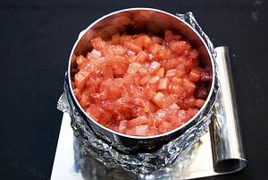 Diesen Tatar auf vier Servierringe von max. 4 cm Durchmesser verteilen, die zuvor unten mit einer Doppellage Alufolie abgedichtet wurden. Ringe im Kühlschrank aufbewahren.