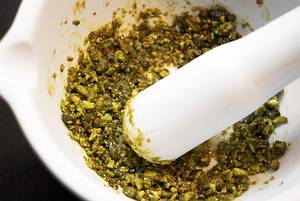 im Mörser zu einer feinbröseligen Pesto verarbeiten.