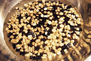 Die getrockneten Hülsenfrüchte über Nacht in reichlich kaltem Wasser einweichen. Die nach 1 Stunde noch immer oben schwimmenden Hülsenfrüchte abnehmen und wegwerfen.
