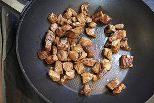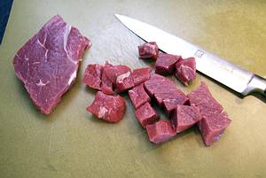 Backofen auf 160 Grad vorheizen, Schüssel und Deckel des Tajine-Topfes 10 Min. in Wasser legen, Schüssel in den Backofen setzen. Lammfleisch in Würfel von ca. 2 cm Größe schneiden.