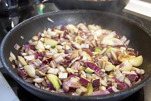 Zwiebeln und Knoblauch schälen, Knoblauch vierteln, Zwiebeln in grobe Stücke schneiden. Zwiebeln im restlichen Öl anbraten.